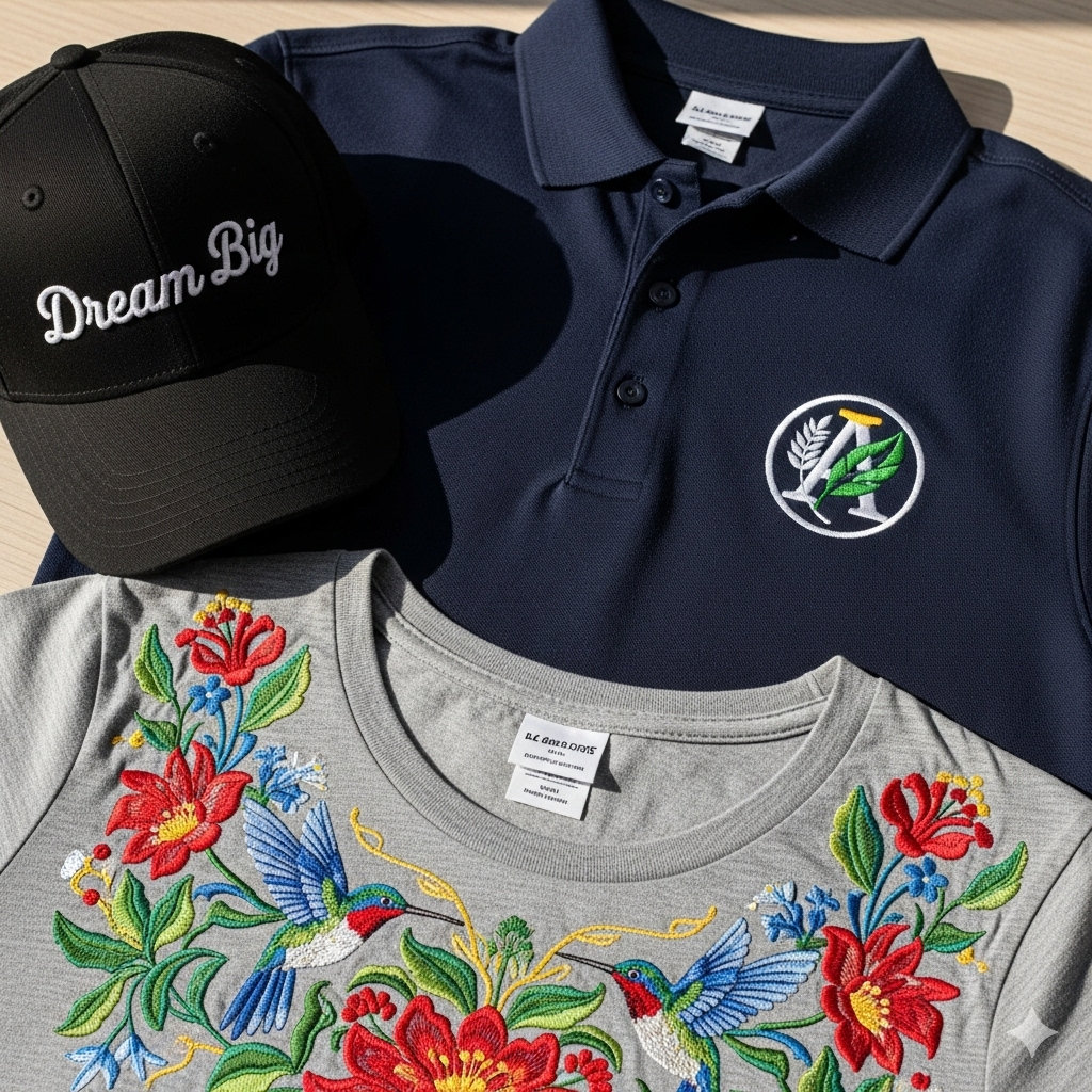 Custom Text Embroidery: Add names, slogans, or messages to t-shirts, caps, and jackets for a personalized touch.